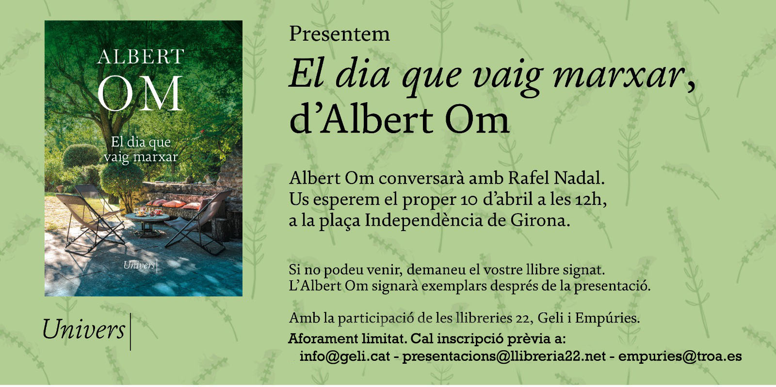 L'Albert Om més personal.A prop de fer 50 anys, un dia l'autor decideix que vol «desaparèixer d'ell mateix», deixar-ho tot i marxar un temps a França, a aprendre francès, la llengua que quan era petit significava per als seus pares la del país de la llibertat i que ara havia estat arraconada per l'omnipresent anglès. I se'n va uns mesos a Aix-en-Provence, on es troba amb ell mateix i amb el plaer de viure amb calma. Compleix així un somni que molts tenim: el de fer un canvi de vida.«(...) volia asseure'm a la terrassa d'un bar, demanar un Pastís, treure la llibreta i transcriure lletres de cançons en francès de Serge Gainsbourg, de La Grande Sophie, de Benjamin Biolay o de Dominique A, i fer el que fem tots, subratllar aquelles frases que sembla que ens donin la raó en les decisions que acabem de prendre: marxar un temps a França quan tens els 50 anys a tocar, quan veus que els teus pares comencen el camí d'anar-se'n i tu, que no tens fills, decideixes anar-te'n abans, per lleugeresa, per por o potser per reunir una mica de coratge pels anys que vindran: «la vie n'est pas finie, la vie n'est pas passé». Ho cantava Dominique A i ho subratllava jo: la vida no s'havia acabat. Aquell temps, a França, ho volia fer tot cada dia i no sabia per on començar.»