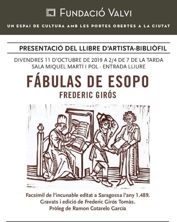 Llibre d’artista-bibliòfil, Fábulas de Ysopet. Edició facsímil del llibre publicat a Saragossa l’any 1489 (incunable). Text original en llengua vulgar i caràcters en gòtica rotunda. Vint-i-tres linogravats executats per l’autor. Reprodueixen, en imatge i format, les xilografies del prefaci i les 20 faules corresponents al «libro primero» de la edició original. Gravats i edició de Frederic Girós. Pròleg de Ramón Cotarelo. Edició de 30 exemplars, numerats i signats, estampats artesanalment un a un.