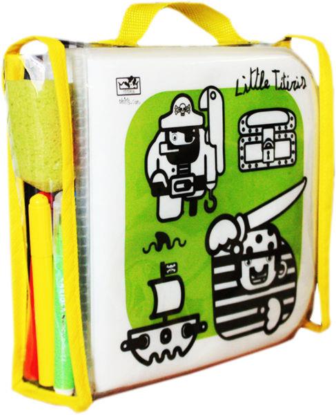 El Llibre de plàstic dels pirates està dissenyat per nens petits d’1 a 4 anys d’edat. Es tracta d’un llibret per aprendre a pintar dins de la línea negre. Es presenta dintre d’una bossa de plàstic transparent per poder-ho transportar a qualsevol lloc. Inclou 4 retoladors de colors i una esponja per practicar tant com es vulgui.