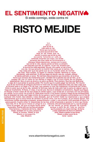 Un año y algunos meses después de irrumpir en el mercado editorial con El pensamiento negativo, Risto Mejide, el controvertido publicista, columnista, jurado de Operación Triunfo y productor discográfico publica una nueva entrega de sus reflexiones sobre el mundo que le rodea. Armado de la honestidad y la contundencia verbal que lo han hecho célebre, y con el mundo de las emociones y “lo negativo” como hilos conductores, en El sentimiento negativo Mejide nos provoca desde su portada/contraportada hasta la última/primera de sus páginas para defender la idea de que lo negativo no es más que la otra cara de la moneda de lo positivo, de la felicidad. Porque la felicidad no deja de ser un sentimiento que el mundo de la publicidad, la televisión o la Iglesia se empeñan en imponernos como meta vital desde el mismo instante en que nacemos, pero puede que para ser feliz no haya que hacer caso de lo que nos diga ningún publicista, el mejor de los telepredicadores o el mismísimo Ratzinger.