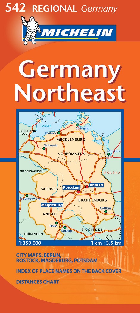 La edición actualizada del mapa Regional Germany Northeast, editado a escala 1/350 000, incorpora un cuadro de distancias, índice de localidades, así como los planos de las ciudades de Berlin, Rostock, Magdeburg y Postdam.