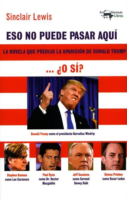 "Eso no puede pasar aquí" se ha convertido en un bestseller en EEUU y Reino Unido tras la victoria de Donald Trump. La novela ofrece la visión de una América en la que un candidato a la presidencia de los EEUU llega al poder cargando contra los inmigrantes, la prensa libre y la gente de la cultura, y anuncia que con él América volverá a sus raíces y a ser grande otra vez en un contexto de crisis económica, desempleo y creciente desigualdad social. ¿Nos suena?