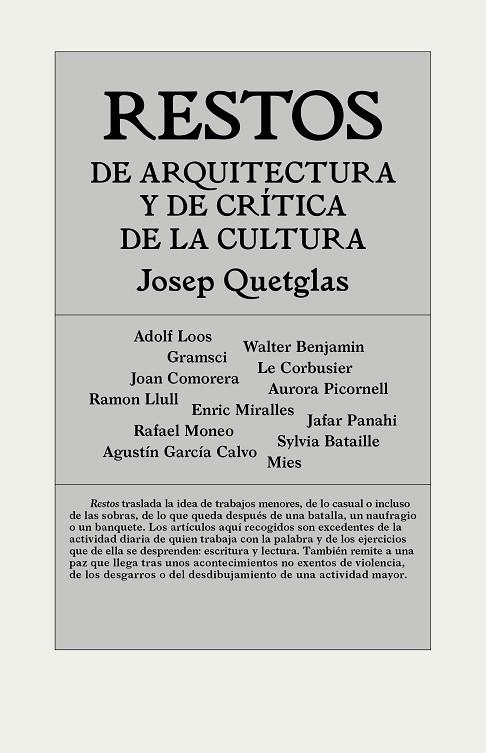 Restos de arquitectura y crítica de la cultura presenta 26 artículos de Josep Quetglas escritos entre el 2002 y 2017. Este nuevo título del autor se publica 10 años después del último libro de ensayos de Quetglas. Restos recoge escritos procedentes de clases, conferencias o artículos que, de no haber sido recopilados, hubieran quedado sueltos y, por difíciles de localizar, perdidos.
