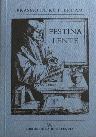 Un homenaje al libro y al proceso editorial desde sus inicios humanistas en el Renacimiento«Aldo esta erigiendo una biblioteca cuyas fronteras son las fronteras de la tierra»...Festina lente (Apresúrate despacio) es un proverbio latino comentado por Erasmo de Rotterdam pero también es, sobre todo, un elogio a la figura de Aldo Manuzio como impresor, quien había comenzado a utilizar dicho proverbio, junto con el grabado de la figura de un delfín enroscándose en un ancla, como marca de la calidad y de la autenticidad de sus libros..