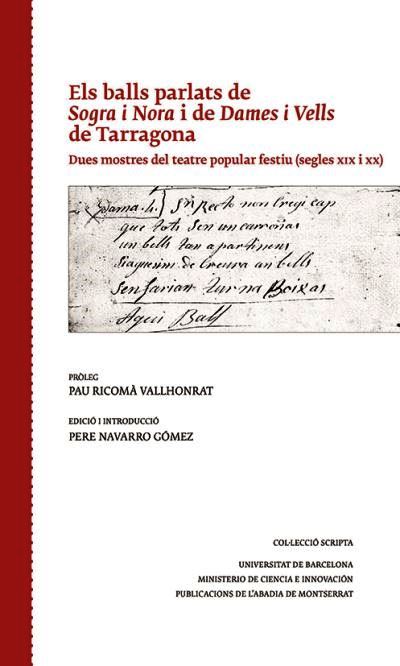 Els balls parlats de Sogra i Nora i de Dames i Vells de Tarragona. Dues mostres del teatre popular festiu (segles XIX i XX) són dues peces teatrals curtes que s'emmarquen en el conjunt d'elements que conformen el Seguici Popular Festiu de la Festa Major de Tarragona, que se celebra en honor a la màrtir Tecla d'Iconi. Aquestes pe-ces teatrals populars de carrer que reben el nom de 'balls parlats' perquè combinen acció dramàtica, diàleg i dansa, de caràcter rudimentari, que no sobrepassa la mitja hora de durada. Els balls parlats s'inscriuen de ple en la cultura popular; general-ment es tracta d'obres anònimes i de datació desconeguda, que s'han transmès per via oral. Ha estat gràcies a la memòria his-tòrica que alguns d'aquests balls s'han mantingut o s'han pogut recuperar després de molt de temps sense haver estat posats en escena. Aquest nou volum de la col·lecció Scripta està dedicat a l'edició i comentaris lingüístics dels textos de dos balls parlats tarragonins: el de Sogra i Nora -sense representació en l'actualitat- i el de Dames i Vells -recuperat l'any 1981; després d'una trentena d'anys desaparegut dels actes de la festa major tarragonina. Del Ball de Sogra i Nora disposem d'un text manuscrit datat a finals del segle XIX. Del Ball de Dames i Vells s'editen cinc textos: el més antic és un manuscrit de 1818; el segon és una adaptació manuscrita de l'anterior feta el 1926; el tercer és un manuscrit que podem datar entre els anys 1931 i 1932; el quart és un altre manuscrit datat el 1946; i el cinquè és un text mecanografiat, adaptat del manuscrit de 1946, de l'any 1956.