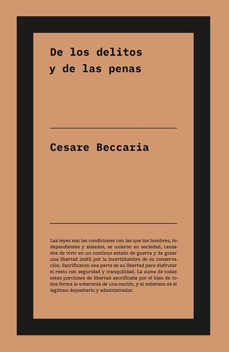 «De los delitos y de las penas» es considerado como uno de los libros más influyentes en la reforma del derecho penal europeo de inspiración ilustrada y penología. En este ensayo jurídico, Beccaria denuncia la situación de atraso y barbarie en que se encontraban los países europeos, rebasada ya la mitad del siglo XVIII y los métodos empleados para juzgar y castigar los delitos. Critica la mezcla de antiguas leyes de pueblos conquistadores y las recopilaciones del emperador Justiniano, que aún regían los sistemas legales. Se trata de la primera reflexión sobre los problemas básicos de la justicia penal desarrollada a partir de los postulados de la Ilustración, lo que permite considerarla obra fundacional del moderno derecho penal.