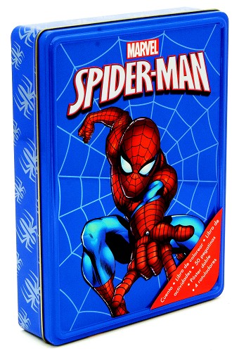 Esta caja metálica contiene un libro de cuentos de 32 páginas, un libro de colorear de 24 páginas y un libro de actividades de 24 páginas. Incluye también 4 rotuladores de colores, un póster doble y una hoja de adhesivos. ¡Pásalo en grande junto al hombre araña! ¡Acción, heroísmo y diversión!