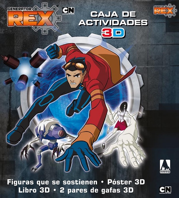 Caja que contiene un desplegable y un libro que narra un episodio de la serie de TV con imágenes en 3D, un póster 3D, dos pares de gafas 3D y unas figuritas de cartón con los personajes de la serie Generator REX que pueden ponerse de pie (con soporte para que se sostengan y el niño juegue con él a m...