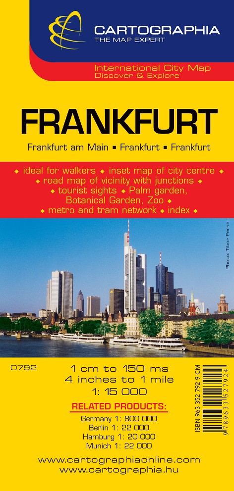 La colección Cartographia abarca planos de ciudades de todo el mundo. El plano de Frankfurt se ha realizado a escala 1/15 000. Incluye además un índice de calles, un mapa de los alrededores de la ciudad, así como un listado de lugares de interés y museos.