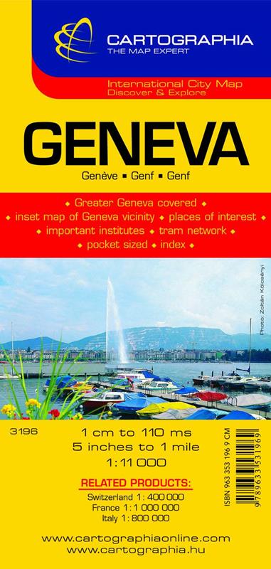 La colección Cartographia abarca planos de ciudades de todo el mundo. El plano de Ginebra se ha realizado a escala 1/11 000. Incluye además un índice de calles, un mapa de los alrededores de la ciudad, así como un listado de lugares de interés e iglesias.