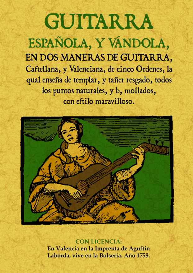 Guitarra española y vandola, en dos maneras de guitarra, castellana y valenciana, de cinco órdenes, la cual enseña a templar y tañer rasgado todos los puntos naturales con estilo maravilloso. Opúsculo breve pero lleno de detalles como las imágenes de cómo se han de hacer los acordes.