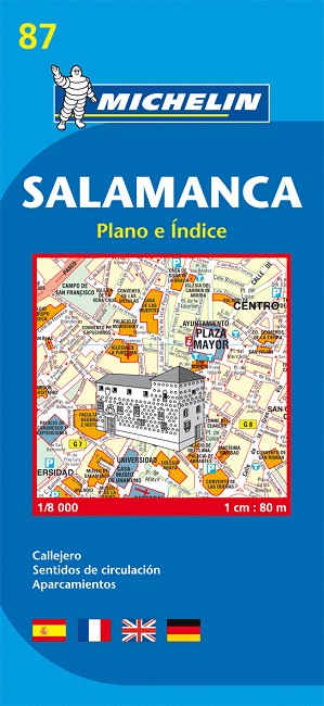 Encuentre todas las informaciones prácticas para recorrer Salamanca a pie, en coche o en bicicleta. El plano MICHELIN Salamanca, a escala 1/8 000 (1cm = 80m), es ideal para recorrer los barrios de la ciudad. Para completar la información incluye transportes, sentidos de circulación, localización de monumentos, así como un anexo con el índice de calles. Incluye signos convencionales en castellano, inglés, francés y alemán.