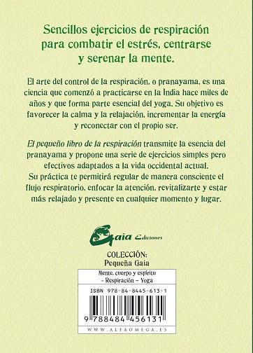 Sencillos ejercicios de respiración para combatir el estrés, centrarse y serenar la mente. El arte del control de la respiración, o pranayama, es una ciencia que comenzó a practicarse en la India hace miles de años y que forma parte esencial del yoga. Su objetivo es favorecer la calma y la relajación, incrementar la energía y reconectar con el propio ser. El pequeño libro de la respiración transmite la esencia del pranayama y propone una serie de ejercicios simples pero efectivos adaptados a la vida occidental actual. Su práctica te permitirá regular de manera consciente el flujo respiratorio, enfocar la atención, revitalizarte y estar más relajado y presente en cualquier momento y lugar.
