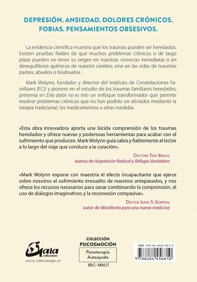 DEPRESIÓN. ANSIEDAD. DOLORES CRÓNICOS. FOBIAS. PENSAMIENTOS OBSESIVOS. La evidencia científca muestra que los traumas pueden ser heredados. Existen pruebas fiables de que muchos problemas crónicos o de largo plazo pueden no tener su origen en nuestras vivencias inmediatas o en desequilibrios químicos de nuestro cerebro, sino en las vidas de nuestros padres, abuelos o bisabuelos. Mark Wolynn, fundador y director del Instituto de Constelaciones Familiares (FCI) y pionero en el estudio de los traumas familiares heredados, presenta en "Este dolor no es mío" un enfoque transformador que permite resolver problemas crónicos que no han podido ser aliviados mediante la terapia tradicional, los medicamentos u otras medidas.