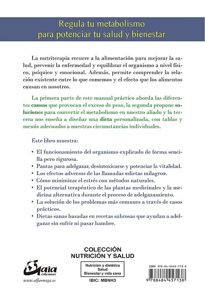 La nutriterapia recurre a la alimentación para mejorar la salud, prevenir la enfermedad y equilibrar el organismo a nivel físico, psíquico y emocional. Además, permite comprender la relación existente entre lo que comemos y el efecto que los alimentos causan en nosotros. La primera parte de este manual práctico aborda las diferentes causas que provocan el exceso de peso, la segunda propone soluciones para convertir el metabolismo en nuestro aliado y la tercera nos enseña a diseñar una dieta personalizada, con tablas y menús adecuados a nuestras circunstancias individuales. Este libro muestra: 02022; El funcionamiento del organismo explicado de forma sencilla pero rigurosa. 02022; Pautas para adelgazar, desintoxicarse y potenciar la vitalidad. 02022; Los efectos adversos de las llamadas «dietas milagro». 02022; Cómo minimizar el estrés con métodos naturales. 02022; El potencial terapéutico de las plantas medicinales y la medicina alternativa durante el proceso de adelgazamiento. 02022; La solución de los problemas más comunes a través de casos prácticos. 02022; Dietas sanas basadas en recetas sabrosas que ayudan a adelgazar sin sufrir ni pasar hambre.