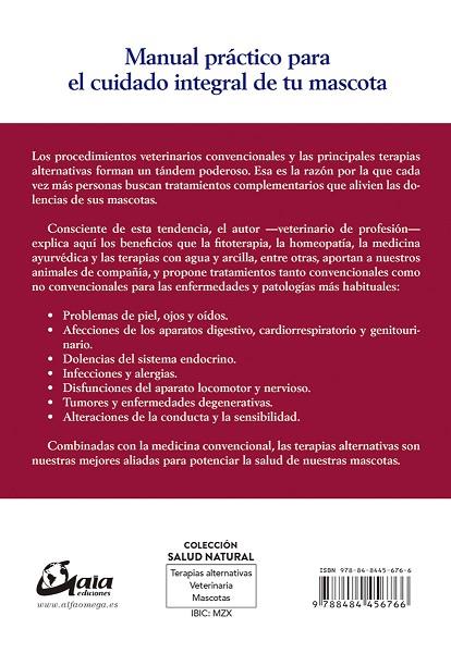 Los procedimientos veterinarios convencionales y las principales terapias alternativas forman un tándem poderoso. Esa es la razón por la que cada vez más personas buscan tratamientos complementarios que alivien las dolencias de sus mascotas. Consciente de esta tendencia, el autor ;veterinario de profesión; explica aquí los beneficios que la fitoterapia, la homeopatía, la medicina ayurvédica y las terapias con agua y arcilla, entre otras, aportan a nuestros animales de compañía, y propone tratamientos tanto convencionales como no convencionales para las enfermedades y patologías más habituales: Problemas de piel, ojos y oídos. Afecciones de los aparatos digestivo, cardiorrespiratorio y genitourinario. Dolencias del sistema endocrino. Infecciones y alergias. Disfunciones del aparato locomotor y nervioso. Tumores y enfermedades degenerativas.