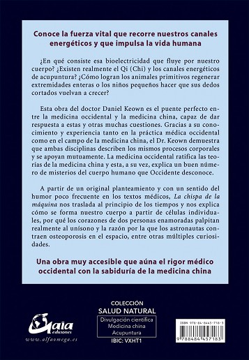 Conoce la fuerza vital que recorre nuestros canales energéticos y que impulsa la vida humana ¿En qué consiste esa bioelectricidad que fluye por nuestro cuerpo? ¿Existen realmente el Qi (Chi) y los canales energéticos de acupuntura? ¿Cómo logran los animales primitivos regenerar extremidades enteras o los niños pequeños hacer que sus dedos cortados vuelvan a crecer? Esta obra del doctor Daniel Keown es el puente perfecto entre la medicina occidental y la medicina china, capaz de dar respuesta a estas y otras muchas cuestiones. Gracias a su conocimiento y experiencia tanto en la práctica médica occidental como en el campo de la medicina china, el Dr. Keown demuestra que ambas disciplinas describen los mismos procesos corporales y se apoyan mutuamente. La medicina occidental ratifica las teorías de la medicina china y esta, a su vez, explica un buen número de misterios del cuerpo humano que Occidente desconoce. A partir de un original planteamiento y con un sentido del humor poco frecuente en los textos médicos, La chispa de la máquina nos traslada al principio de los tiempos y nos explica cómo se forma nuestro cuerpo a partir de células individuales, por qué los corazones de dos personas enamoradas palpitan realmente al unísono y la razón por la que los astronautas contraen osteoporosis en el espacio, entre otras múltiples curiosidades. Una obra muy accesible que aúna el rigor médico occidental con la sabiduría de la medicina china.