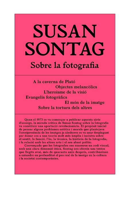 Es tracta d’un llibre clàssic de la història de la crítica d’art i que hem acompanyat de dos textos que va escriure Susan Sontag al final de la seva vida, també sobre fotografia.