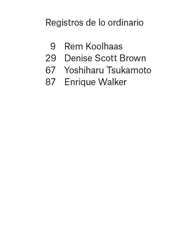 Este libro recoge cuatro conversaiones con Rem Koolhaas, Denise Scott Brown y Yoshiharu Tsukamoto. Desde principios de este siglo, la disciplina de la arquitectura ha centrado vehementemente su atención en documentar la condición urbana contemporánea. Cada ciudad ha sido examinada como un repositorio de conceptos arquitectónicos, interrogada como un manifiesto urbano, registrada como una serie de objetos encontrados. Registros de lo ordinario articula una genealogía potencial para esta práctica y para el género de libros que de ella se deriva, y forma parte también del proyecto que Enrique Walker recogió en el libro Lo ordinario (Editorial Gustavo Gili, Barcelona, 2010). Organizado en torno a conversaciones con los autores de tres textos fundamentales que documentan la ciudad —Rem Koolhaas con Delirio de Nueva York, Denise Scott Brown con Aprendiendo de Las Vegas y Yoshiharu Tsukamoto con Made in Tokyo—, este volumen rastrea la historia de estos “libros sobre ciudades” al examinar el material que registraron, los hallazgos que establecieron, los argumentos que formularon y los proyectos que promovieron. Estas conversaciones también cuestionan los supuestos subyacentes a esta práctica, y si en su ubicuidad esta aún supone un espacio de oportunidad.