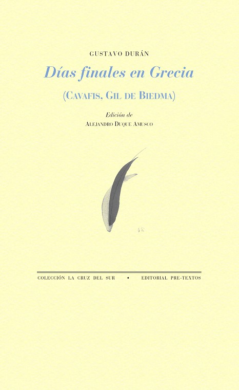 GUSTAVO DURÁN (1906-1969), mítico y legendario personaje, era conocido como músico y compositor de la Generación del 27, como militar y estratega del bando republicano durante la Guerra Civil Española y, ya en el exilio, como diplomático en USA y alto funcionario de las Naciones Unidas. Lo que pocos sabían es que, en la etapa final de su vida, transcurrida en Grecia, se dedicó a traducir poemas de Constantino Cavafis. Esas traducciones –cronológicamente de las primeras realizadas del poeta de Alejandría por un español– seguían inéditas, y aquí se ofrecen, bajo el elocuente título de Días finales en Grecia, cuando acaban de cumplirse los cincuenta años de la muerte de Durán. Tienen el interés de ser respetuosas al máximo con la “poesía de ideas” de Cavafis y de traer al recuerdo al poeta Jaime Gil de Biedma, cavafiano de la primera hora, amigo y mentor poético de Durán. Con esta edición, pulcra y minuciosa, al cuidado de Alejandro Duque Amusco, se recupera una interesante página de nuestra reciente historia literaria.