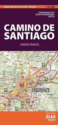 Este mapa muestra la ruta completa del Camino Francés de peregrinación jacobea a Santiago de Compostela. La ruta está marcada y las secciones que se pueden hacer a pie y en bicicleta están diferenciadas. También están marcados los santuarios, iglesias y patrimonio de interés que jalonan el camino, puntos donde comprar comida, fuentes, albergues y otros establecimientos donde dormir... todos los lugares de interés para el peregrino. El Camino Francés es la ruta jacobea con más tradición e internacionalmente reconocida. Está jalonada por magníficos paisajes y un rico patrimonio, Este mapa recoge la entrada en territorio español por Roncesvalles, en Navarra; luego desciende y cruza la ciudad de Iruñea [Pamplona] y se une a la ruta aragonesa a Puente la Reina (Navarra), desde donde el Camino Francés mantiene una ruta única que cruza localidades y ciudades como Estella, Logroño, Santo Domingo de la Calzada, Burgos, Frómista, Carrión de los Condes, León, Astorga, Ponferrada ... y entra en Galicia por la región del Bierzo.