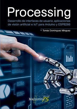 Processing es un lenguaje de programación con un entorno de desarrollo integrado, pensado para todo tipo de usuarios interesados en dotar a sus proyectos con una salida visual de la información. Si quiere descubrir cómo Processing deviene un complemento ideal para Arduino y ESP8266, este es su libro. Con él podrá ir más allá de la recogida de datos de sensores o el manejo de servos y motores, lo que le permitirá crear interfaces y entornos visuales interactivos para llevar sus proyectos con Arduino y ESP8266 a un nuevo nivel. Gracias a la multitud de prácticas que presenta el manual y la explicación paso a paso de los códigos podrá: o Desarrollar proyectos de forma rápida y sencilla, aprendiendo un nuevo lenguaje casi sin darse cuenta, ya que el entorno de desarrollo interactivo (IDE) en Arduino y Processing son muy similares. o Crear interfaces gráficas de usuario para presentar de forma vistosa todo tipo de información y realizar cualquier actividad de control desde un ordenador. o Conectar su ordenador o teléfono móvil a su Arduino de forma remota con Bluetooth o WiFi. o Usar protocolos de internet de las cosas (IoT) para recibir datos y dar órdenes a través de un móvil con acceso a Internet a cualquier dispositivo conectado a Arduino o ESP8266. o Procesar imágenes con métodos de visión artificial que le permitan identificar caras u objetos e, incluso, hacer un seguimiento de sus movimientos. o Desarrollar programas de realidad aumentada que añadan información gráfica o textual en tiempo real a las imágenes obtenidas de una cámara web. Además, en la parte inferior de la primera página del libro encontrará el código de acceso que le permitirá descargar de forma gratuita los contenidos adicionales en www.marcombo.info. Con la amplia variedad de técnicas reunidas en este libro podrá llegar a realizar casi cualquier cosa con Arduino y ESP8266. Disfrute de las enormes posibilidades de una plataforma que no para de crecer y sobrepase los límites de su imaginación. Tomás Domínguez es ingeniero de telecomunicación y doctorado en inteligencia artificial. Su labor profesional se ha desarrollado en una multinacional de telecomunicaciones, donde ha ocupado diversos cargos relacionados con la tecnología. Asimismo, ha ejercido como profesor universitario de ingeniería informática en la Universidad Alfonso X el Sabio de Madrid.
