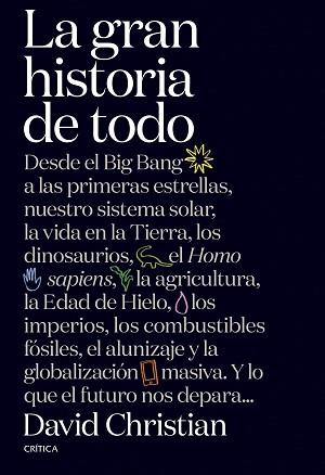 David Christian nos acompaña en un viaje a lo largo de los 13.800 millones de años que hemos conocido como «historia», ayudándose de ocho momentos clave en los que las condiciones adecuadas han permitido que surjan nuevas formas de complejidad. Y lo hace trazando una «gran historia» en la que todo está conectado, que discurre desde el Big Bang, el sistema solar, la aparición de la vida, los dinosaurios, el Homo sapiens y los grandes imperios hasta la globalización. Un libro que ha despertado el entusiasmo de lectores como Bill Gates o el físico Carlo Rovelli quien lo considera «un método espectacular para poner orden en todos nuestros conocimientos sobre el mundo».