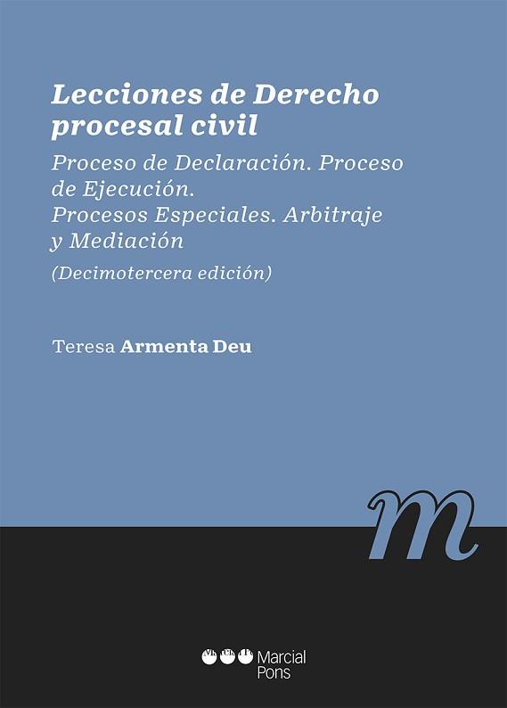 Consolidado como manual de referencia, estas Lecciones de Derecho procesal civil optan por reunir la materia procesal civil (proceso declarativo, de ejecución, especialidades de los procesos ordinarios y procesos especiales) en un solo volumen que permite y facilita tanto su uso indistinto en las diversas fórmulas de asignaturas (troncales y optativas), como una visión general del conjunto del Derecho procesal civil. Se dirigen a estudiantes de grado y máster, pero también a abogados y juristas en general que buscan una cuidada puesta al día y constante atención a la legislación nacional y europea, así como a su respectiva jurisprudencia interpretadora. En esta edición, por destacar alguna novedad: las relativas al apoyo a las personas con discapacidad en el ejercicio de su capacidad jurídica, la ley sobre servicios electrónicos de confianza o la protección de datos, entre otras. Con un método expositivo que diferencia el cuerpo de escritura según la profundidad con que se quiera acometer cada tema, y esquemas en materias concretas (realización forzosa en la ejecución, procesos ordinarios, especialidades procedimentales o procesos especiales), se ofrece respuesta didáctica y adecuada a los diversos intereses de cada lector. La exposición se completa con sendas lecciones dedicadas al arbitraje y la mediación, como método alternativo y complementario de la jurisdicción, respectivamente.