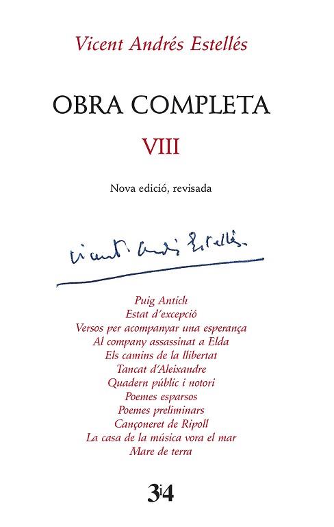 Aquesta Obra Completa -Nova edició, revisada- constitueix un nou projecte d'edició de l'obra estellesiana que conté estudis introductoris, un treball de reorganització cronològica de les obres i d'edició filològica dels poemes estellesians. El vuitè volum ha estat preparat per Jordi Oviedo i Irene Mira-Navarro, i inclou els següents poemaris: Puig Antich, Estat d’excepció, Versos per acompanyar una esperança, Al company assassinat a Elda, Els camins de la llibertat, Tancat d’Aleixandre, Quadern públic i notori, Poemes esparsos, Poemes preliminars, Cançoneret de Ripoll, La casa de la música vora el mar, i Mare de terra.
