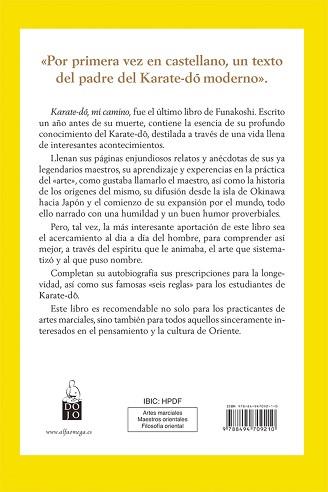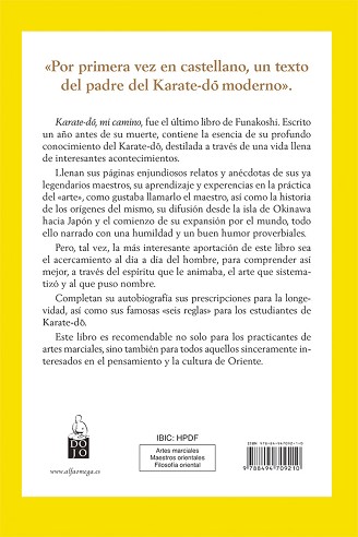 Karate-do-, mi camino, fue el último libro de Funakoshi. Escrito un año antes de su muerte, contiene la esencia de su profundo conocimiento del Karate-do-, destilada a través de una vida llena de interesantes acontecimientos. Llenan sus páginas enjundiosos relatos y anécdotas de sus ya legendarios maestros, su aprendizaje y experiencias en la práctica del «arte», como gustaba llamarlo el maestro, así como la historia de los orígenes del mismo, su difusión desde la isla de Okinawa hacia Japón y el comienzo de su expansión por el mundo, todo ello narrado con una humildad y un buen humor proverbiales. Pero, tal vez, la más interesante aportación de este libro sea el acercamiento al día a día del hombre, para comprender así mejor, a través del espíritu que le animaba, el arte que sistematizó y al que puso nombre. Completan su autobiografía sus prescripciones para la longevidad, así como sus famosas «seis reglas» para los estudiantes de Karate-do-. Este libro es recomendable no solo para los practicantes de artes marciales, sino también para todos aquellos sinceramente interesados en el pensamiento y la cultura de Oriente.