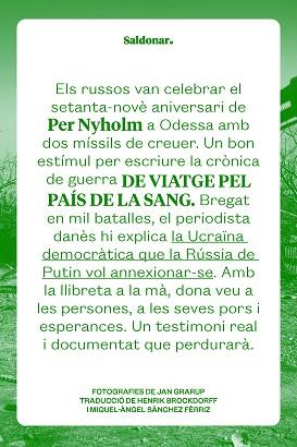 Una guerra devastadora sacseja el cor d’Europa. Vladímir Putin vol una Gran Rússia, des de l’oceà Pacífic fins al mar Bàltic. Aquest desig d’expansió és una constant històrica que dura segles, des de Pere el Gran. Ara Rússia terroritza Ucraïna, un país democràtic que es gira cap a Europa i que va cometre el sacrilegi de donar l’esquena a Moscou. Els ucraïnesos, comandats per Volodímir Zelenski, resisteixen els embats russos i tenen la convicció que se’n sortiran. Per Nyholm, veterà periodista danès que ha bregat en desenes de conflictes arreu del món, transita pels escenaris de la guerra al país de la sang, amb un llibre d’Heròdot a la butxaca, i recull les paraules de les víctimes de la barbàrie que perpetra Rússia, i hi posa context. Lviv, Txernivtsí, Úman, Voznesensk, Mikolaiv, Kíiv, Khàrkiv, Poltava, Odessa… Noms de ciutats que gairebé no sabíem i que ara Nyholm recorre, sense armilla i amb una llibreta a la mà, per explicarnos què hi passa, com viuen els seus habitants enmig de la catàstrofe que els assetja, de quina manera gestionen la por del dia a dia. I quines són les escletxes per on entra l’esperança.